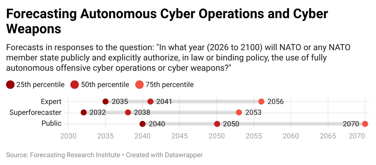 The median expert forecasts that NATO or a member state will publicly authorize fully autonomous offensive cyber operations in the coming decades (a median forecast of 2041), with superforecasters predicting this will occur slightly earlier, in 2038. A quarter of experts expect this policy shift to occur in 2035 or earlier.