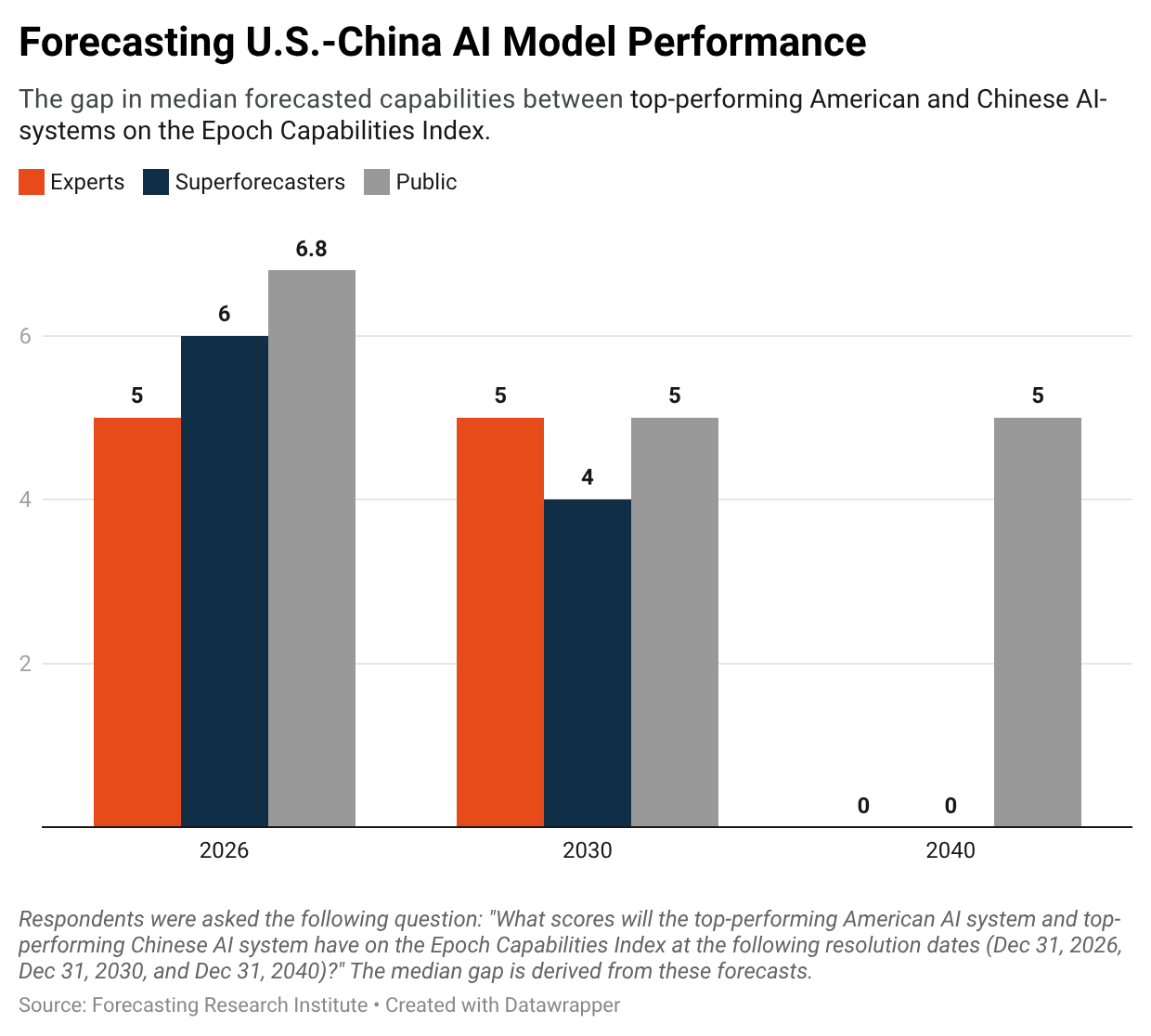 Experts and superforecasters forecast that Chinese AI systems will roughly match American ones on benchmarks by the end of 2040. At the time this survey was published (January 2026), the top Chinese models lagged behind U.S. models by nine points on the Epoch Capabilities Index. At the time of writing (February 2026), this gap is six points. The median expert expects this gap to narrow to five points by the end of 2030 and to zero by the end of 2040.1