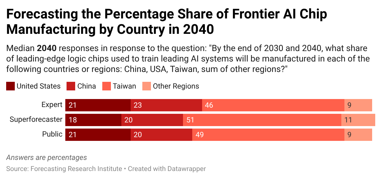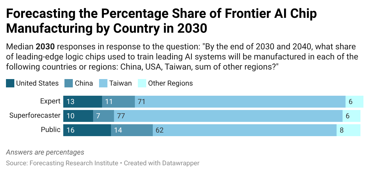 Forecasters cited national security concerns as the major factor driving increased U.S. leading-edge chip manufacturing, arguing that onshore chip production could serve as insurance against blockade, conflict, or disruption. Forecasters also expected China to scale up its leading-edge chip manufacturing abilities, eventually reaching technical parity with the U.S. and Taiwan.