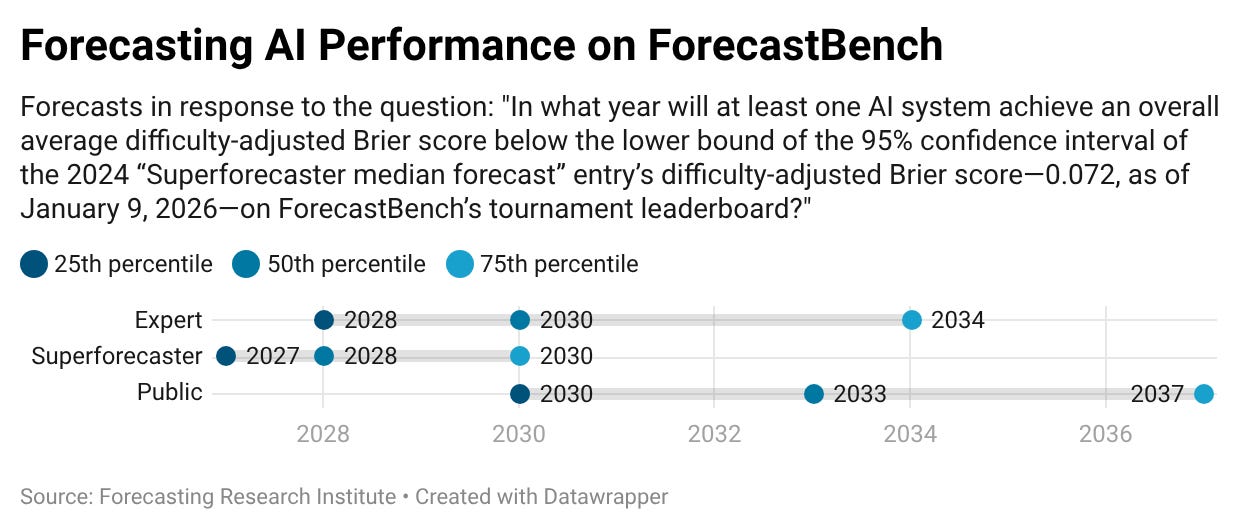 Superforecasters themselves are the most bullish group on automated forecasting progress, with the median superforecaster predicting AI systems will beat their ForecastBench benchmark by 2028, which is earlier than both the median expert (2030) and the median public (2033) forecast.