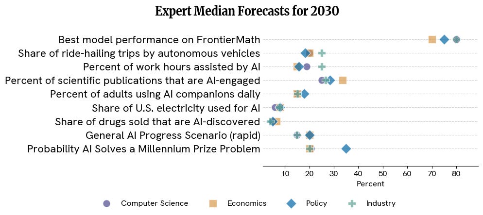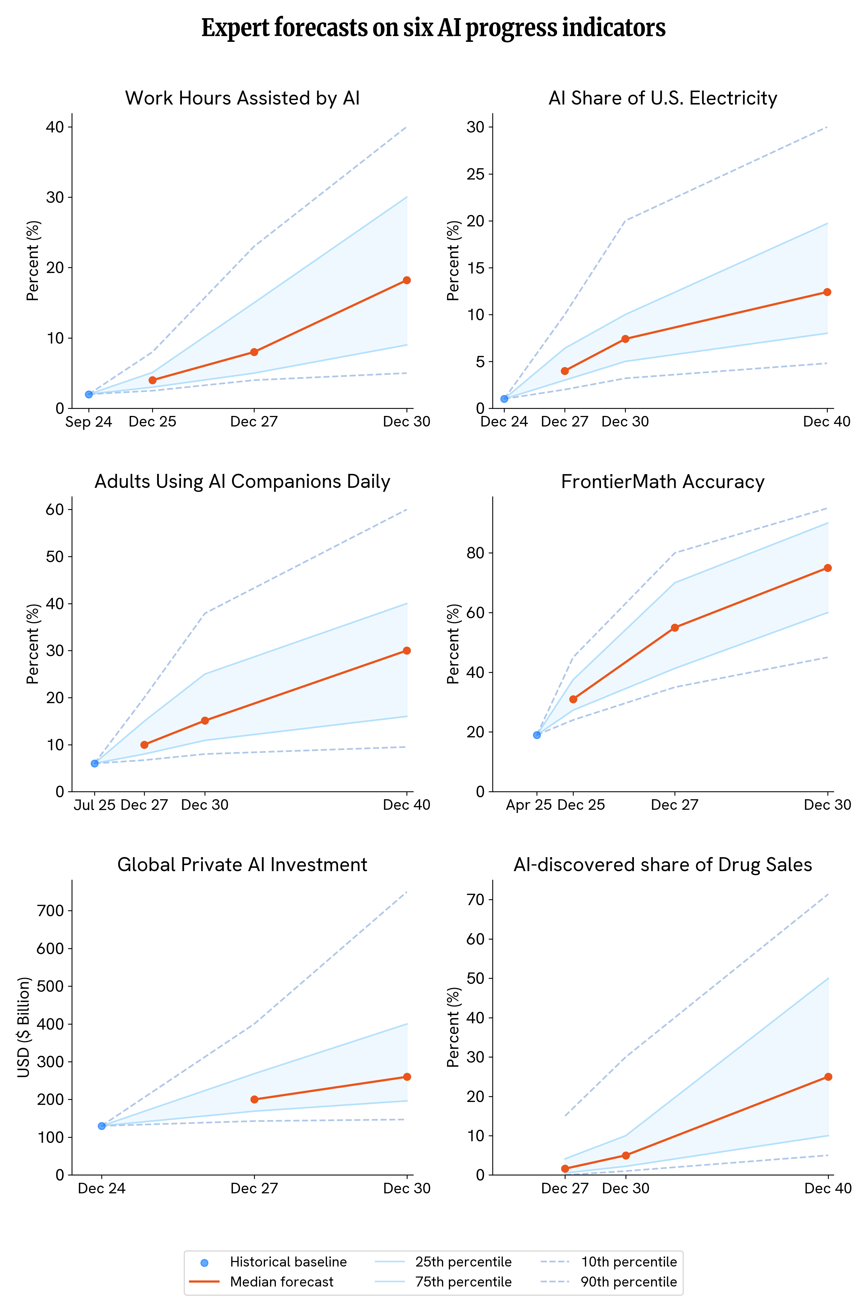 Work: The median expert forecast is that 18% of work hours in the U.S. in 2030 will be assisted by generative AI, up from approximately 4.1% in November 2024.