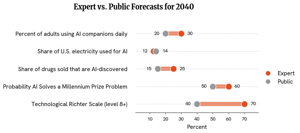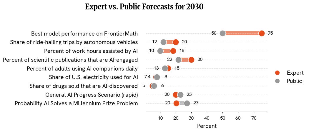 Thank you for sharing. I really enjoyed reading that very different perspective. It is very apparent where the frontier leaders are so much more bullish on when AGI is achieved versus a median expert. Also, it was interesting to read about the expert versus public perceptions. Looking forward to the next one.