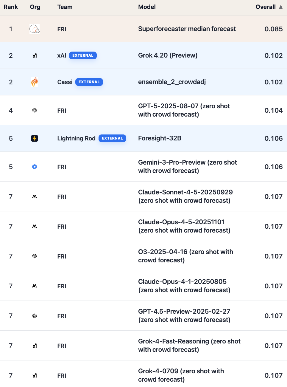 Two external submissions—xAI’s Grok 4.20 (Preview) and Cassi’s ensemble_2_crowdadj—are tied at #2, both ahead of our own runs of GPT-5, o3, and Claude Sonnet 4.5. Superforecasters are #1, leading state-of-the-art LLMs by 0.017 Brier points.